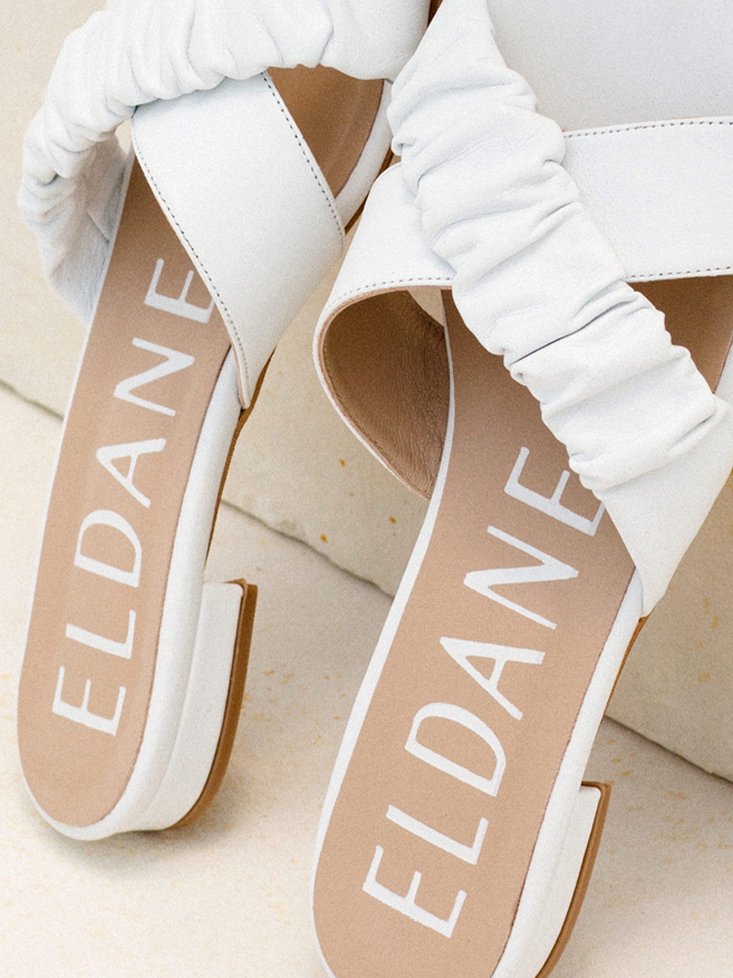 The Mia flat sandals are decorated with a ruched white leather strand. This round-toe pair has soft leather cross-over straps that beautifully frame your feet and is set on cushioned insoles for a comfortable fit.