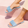 The Loretta white slides have squared toes and leather straps that are ruched for a unique, textured look. These soft flat sandals rest on square-toe footbeds and have slight heels, so you can wear them comfortably all day or evening.
