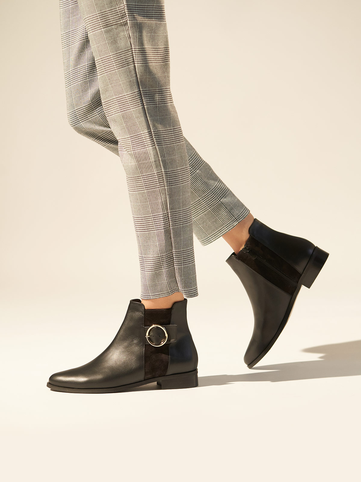 Les bottines Miriam ont une boucle circulaire dorée sur le côté. Elles sont réalisées en cuir noir véritable avec des détails en daim. Elles reposent sur des talons en bois empilés et des semelles en caoutchouc tunit.