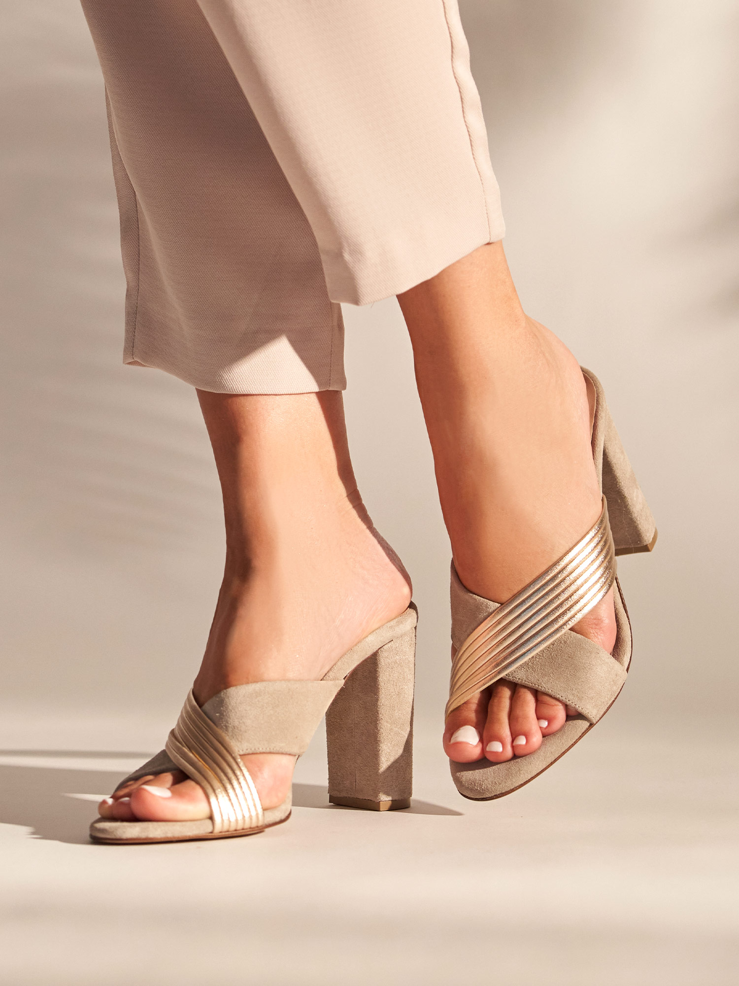 • Heeled leather mules in sand and gold