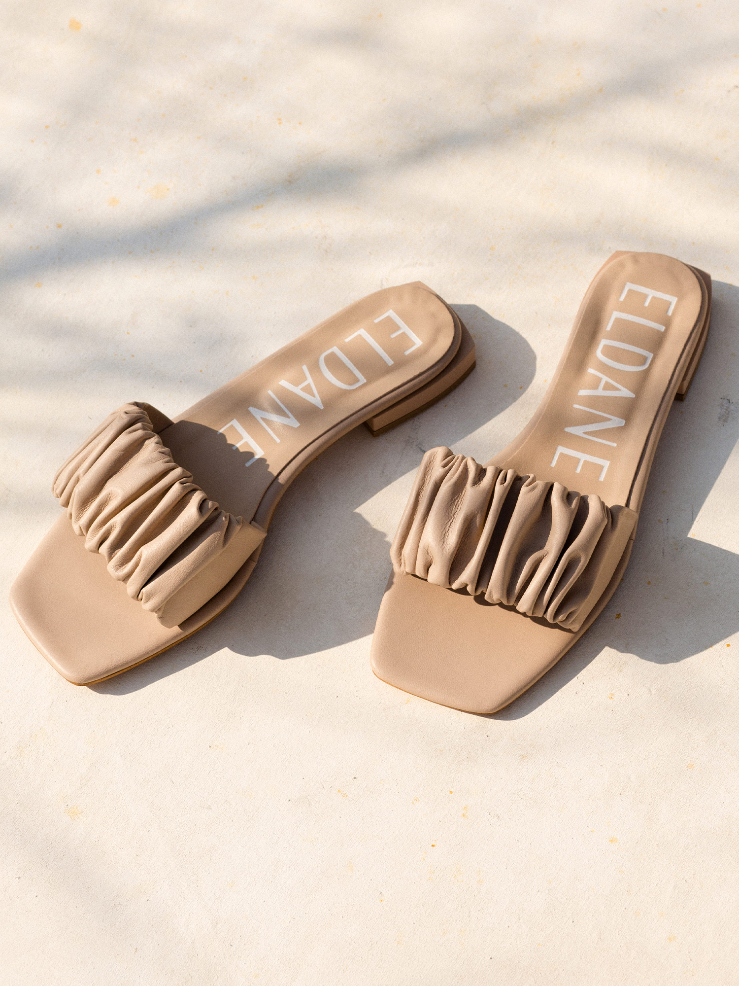 Μπεζ δερμάτινα σανδάλια ELDANE Loretta. Σχέδιο με μια φαρδιά λωρίδα με σούρα σε καρέ φόρμα. Κατασκευασμένα με τετράγωνο τακούνι και μαλακό πάτο.