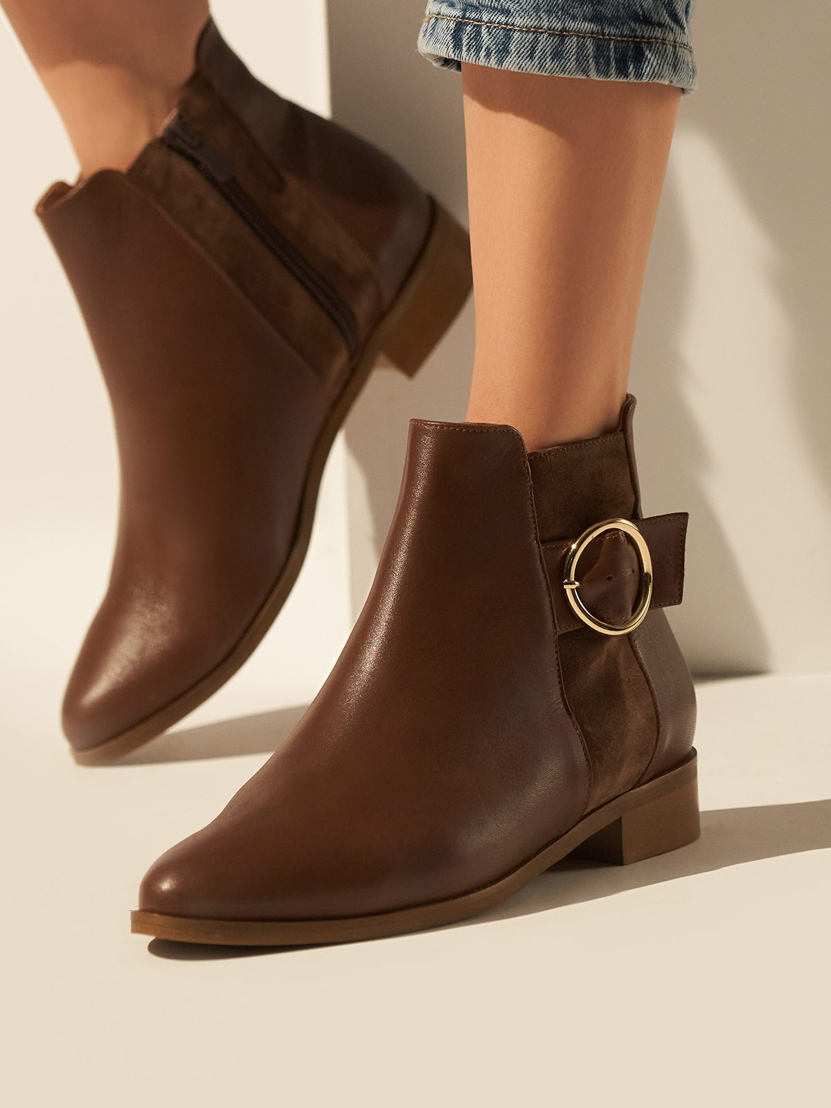 Καφέ δερμάτινα μποτάκια Miriam. Σχέδιο με διακοσμητική χρυσή αγκράφα και λείο δέρμα. Κατασκευή με ίσιο τακούνι 3 εκ. και κλείσιμο με φερμουάρ στο μέσα μέρος.