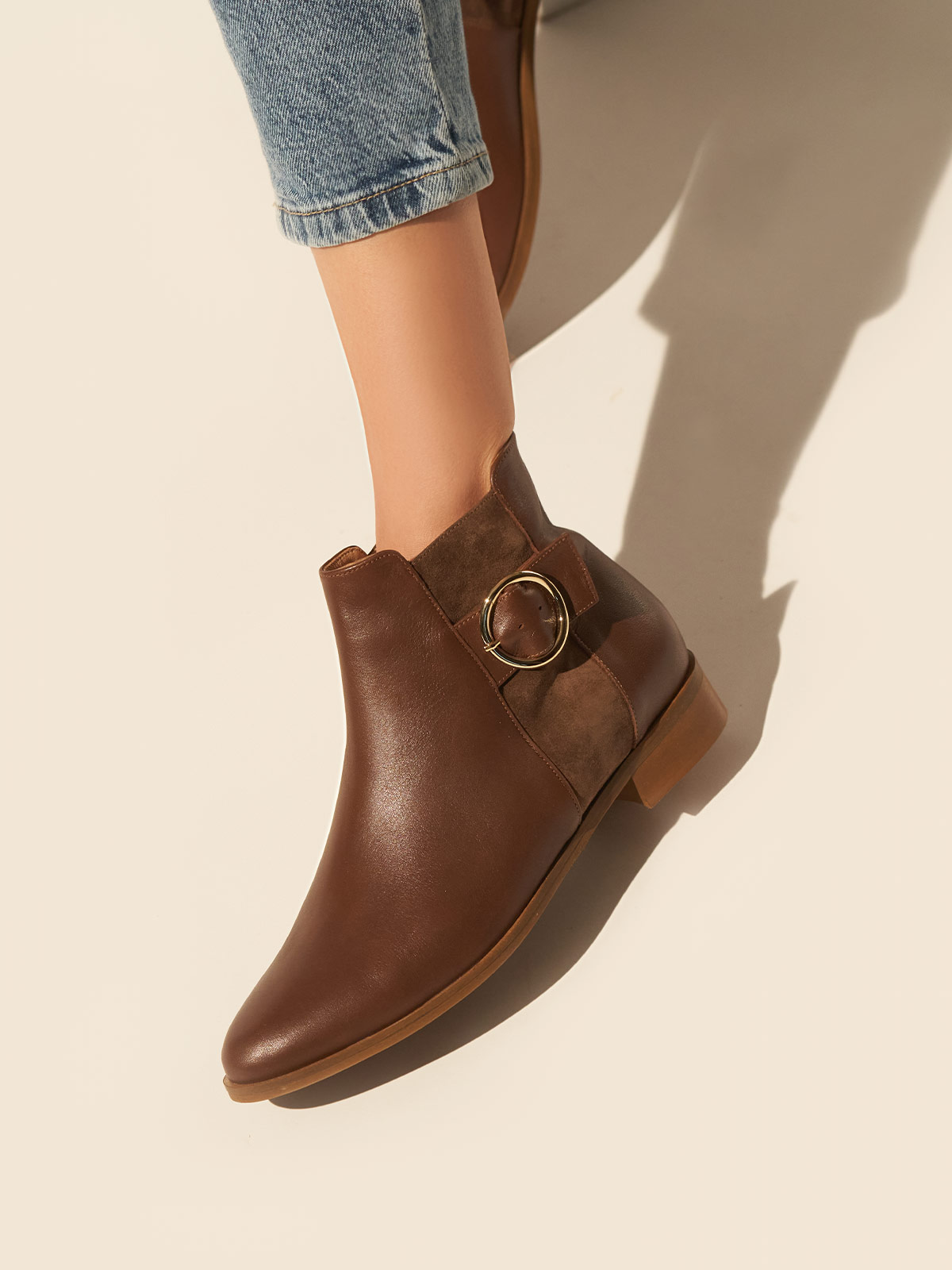 The Miriam ankle boots have a circular golden buckle on the side. They’re made from genuine brown leather with a suede detail. They rest on stacked wooden heels and tunit rubber soles.