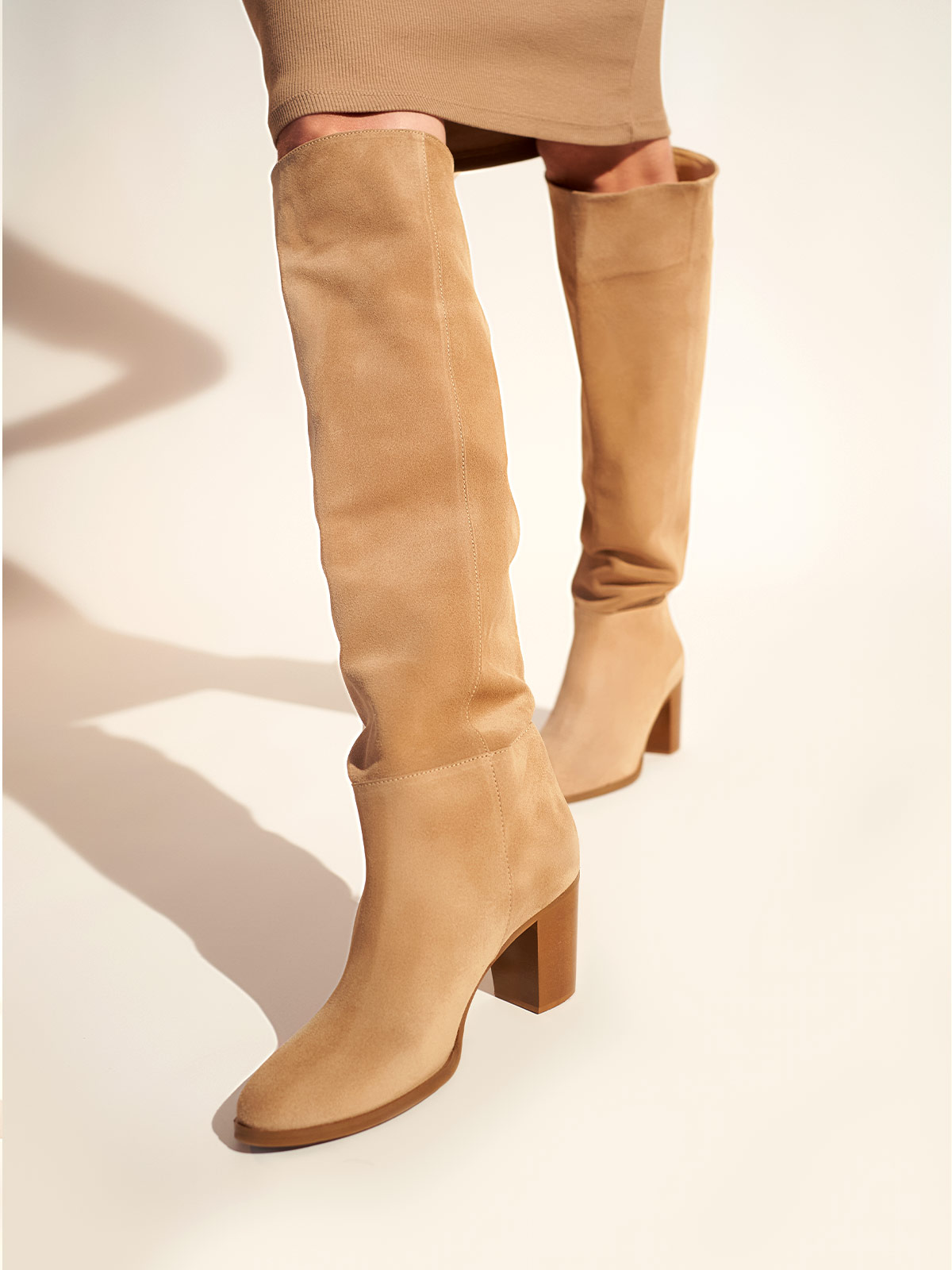 The Phoebe boots have a slouchy, scrunchable shape that’ll work just as well over skinny pants as under a midi dress. They’ve been made from soft suede leather and grounded on 65mm block wooden heels. Calf circumference ~40cm. Height measured from heel ~48cm.