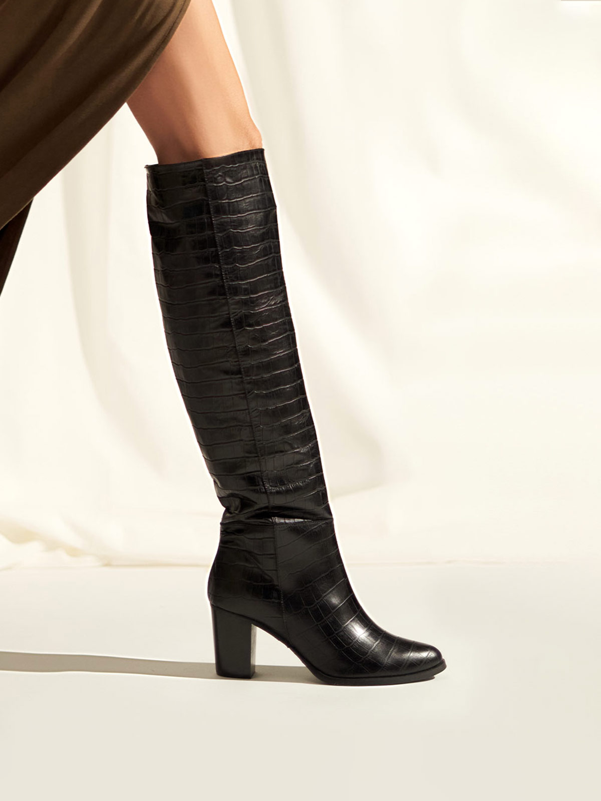 The Phoebe boots have a slouchy shape that’ll work just as well over skinny pants as under a midi dress. They’ve been made from croc-effect leather and grounded on 65mm block heels. Calf circumference ~40cm. Height measured from heel ~48cm.