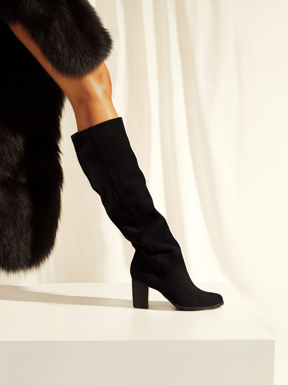 The Phoebe boots have a slouchy, scrunchable shape that’ll work just as well over skinny pants as under a midi dress. They’ve been made from soft suede leather and grounded on 65mm block wooden heels. Calf circumference ~40cm. Height measured from heel ~48cm.