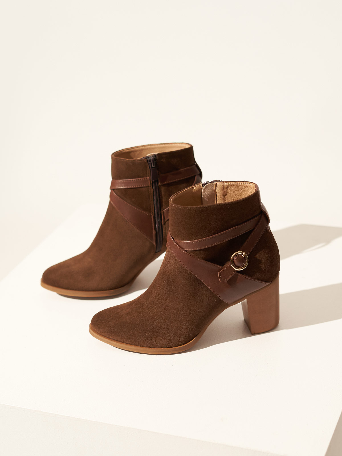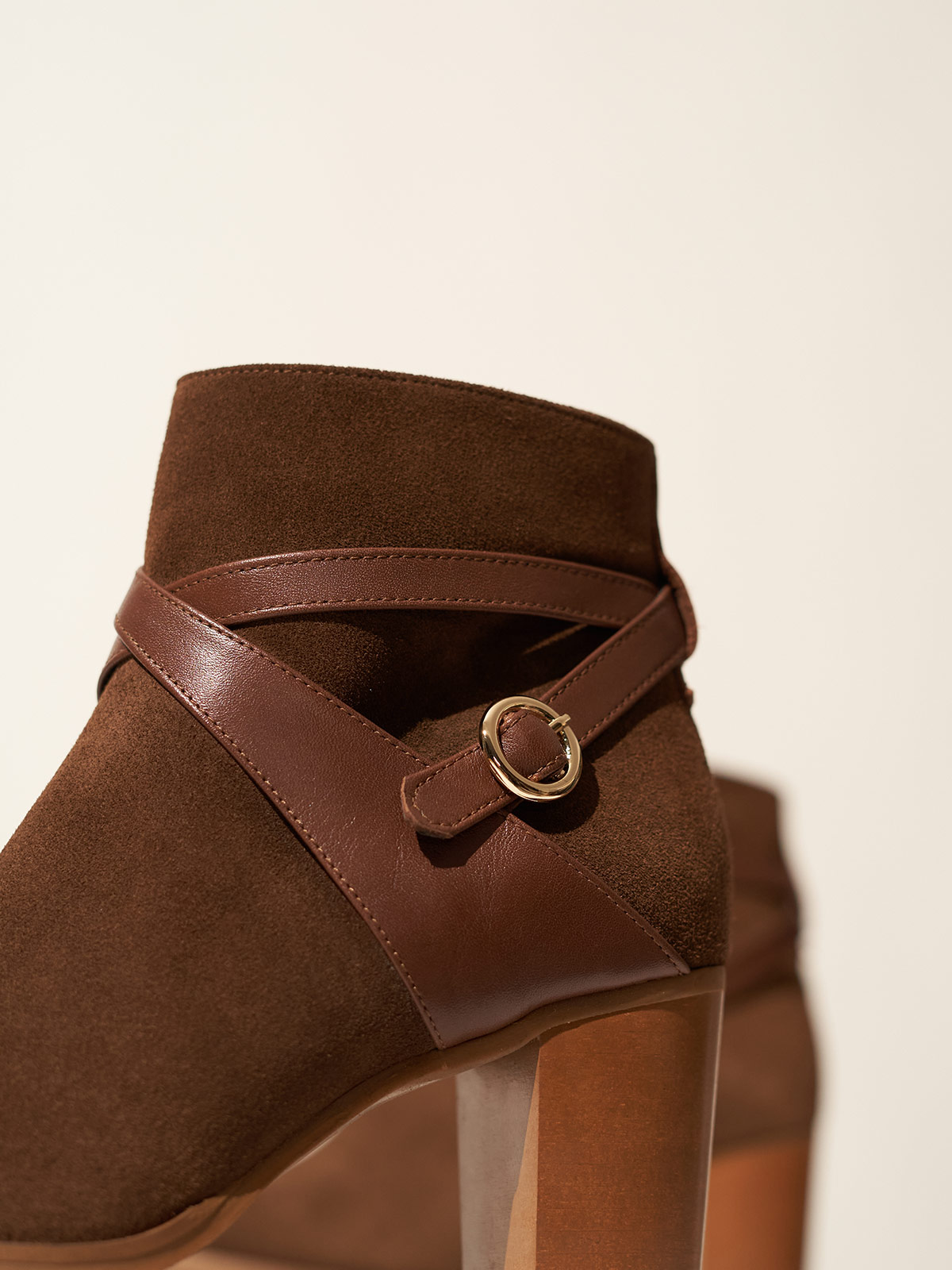 The Regina boots are made from soft suede leather in a brown hue. They have brown leather straps that cradle the ankle with a delicate gold buckle offering a stylish twist. The wooden heels offer 65mm of lift, so you can wear them comfortably all the day.