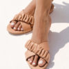 The Mia flat sandals are decorated with a ruched light blue leather strand. This round-toe pair has soft leather cross-over straps that beautifully frame your feet and is set on cushioned insoles for a comfortable fit.